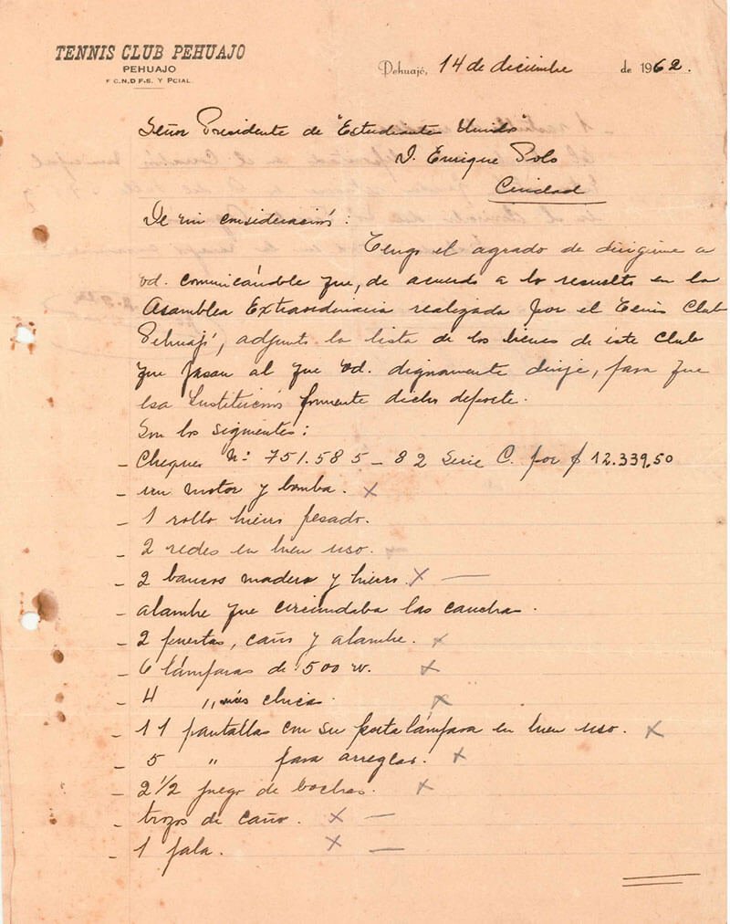 En Diciembre de ese año el tenis recibe un gran impulso en el Club, al recibir una importante donación de materiales y dinero en efectivo del Tennis Club Pehuajó, que desarrollaba sus actividades en la actual Plaza Italia.